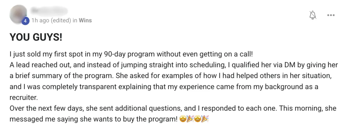 "I was writing weekly articles, cranking out content, and my monthly income was $500. I'd been fiddling with my offer for close to a year — trying courses, trying different things, second-guessing myself. Once I followed a structured path, I consistently started hitting $5,000 to $10,000 months. [...] I recently had a $5,000 plumbing emergency. Before the program, that would have wrecked a couple weeks of my life — I would have been stressed, running around, worried about my emergency fund. Now I have that buffer. That's the kind of change this created for me."